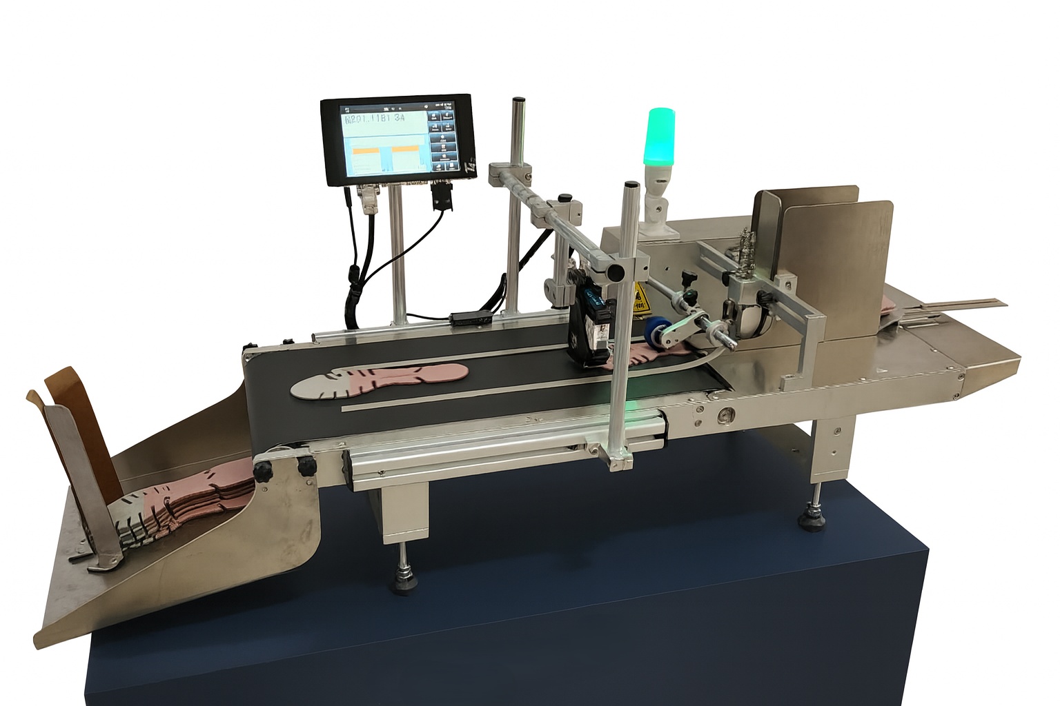 Enquanto o dispensador posiciona cada embalagem com precisão, a TIJ T4 realiza a codificação de dados variáveis em alta definição, como datas, lotes, códigos de barras e logotipos.